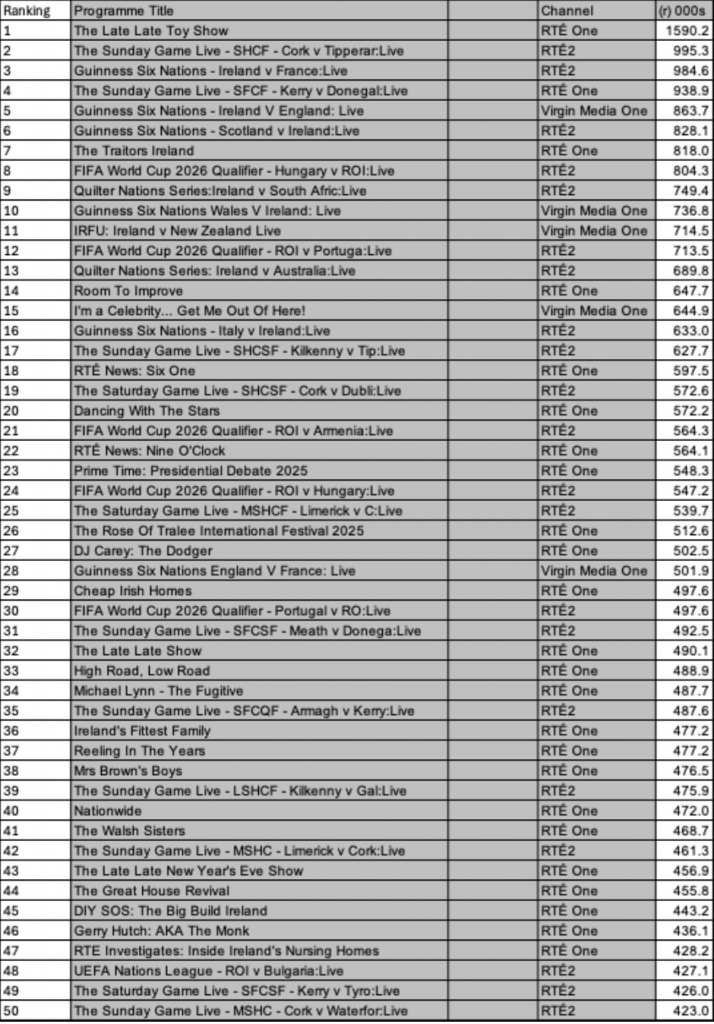 Irish-produced, broadcaster-led programming continued to shine in 2025. The Late Late Toy Show (3) was the highest-rated programme of the year across all channels available in Ireland, once again proving its unmatched ability to bring the nation together. Entertainment programming also performed exceptionally well, with shows such as The Traitors Ireland, Room to Improve, I’m a Celebrity… Get Me Out of Here! and Dancing with the Stars all featuring in the top 20 programmes of the year. News and current affairs had a standout year again in 2025, reflecting the public’s trust in broadcast journalism, with major moments such as the Prime Time Presidential Debate ranking highly.